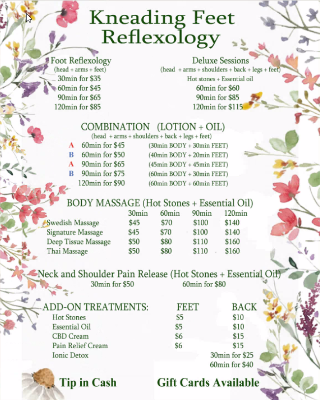 Welcome to Kneading Feet Reflexology. Reflexology has been practiced for thousands of years. The practice has been traced to ancient China and Egypt, but an American doctor, Eunice Ingram first mapped the pressure points in 1930. Based on the principle that all of our nerves are connected, reflexologists access the pressure points, primarily in the hands and feet to help ease stress and aid in relaxation.